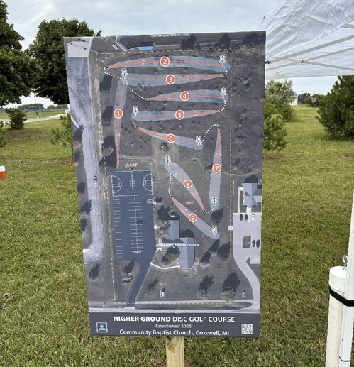 Explore our newly established disc golf course, Higher Ground, where nature and sport come together for a memorable outdoor adventure. The Higher Ground Disc Golf course, created by the Community Baptist Church in Croswell, MI, features 9 holes and can be accessed through the church's parking lot located at 5501 Peck Road in Croswell, MI. It is available for public use whenever church services are not taking place, which occur from 9:30 AM to noon on Sunday mornings, from 5:30 PM to 7 PM on Sunday evenings, and from 6 PM to 8 PM on Wednesdays.